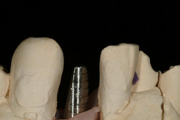 由於患者的下顎前牙區排列不整,因此與技師溝通牙齒之外形與排列必須與患者之原口內狀況相仿,而圖九及與圖十為技工室完成的植牙假牙模型