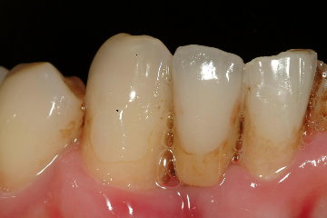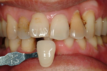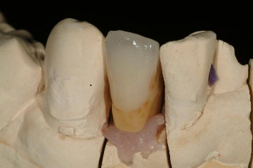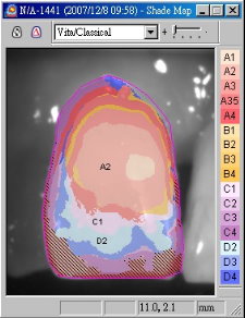 經過四週後,由於傷口癒合良好,準備製作假牙,由於是前牙區,因此顏色相當重要,因此使用數位比色(圖七)及數位攝影(圖八),取得牙齒之精確顏色分佈。