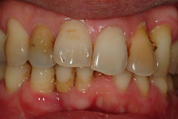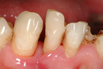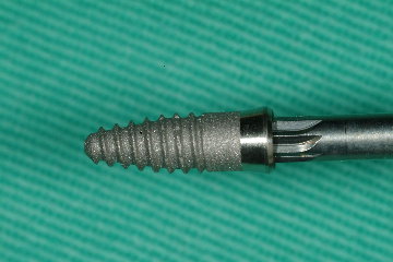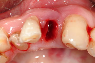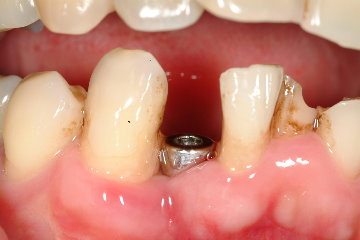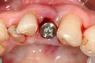 圖三為拔牙後的完整骨槽骨形狀,圖四為使用之Omni Tight人工植牙體,圖五為立即植牙後的情形,這時流血已完全停止,而齒槽骨與人工植第之縫隙再使用合成人工骨粉修復之,圖六為一週後牙肉之恢復情況