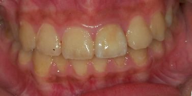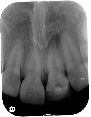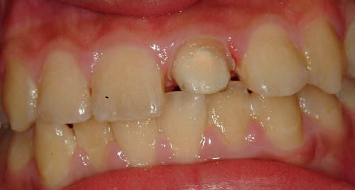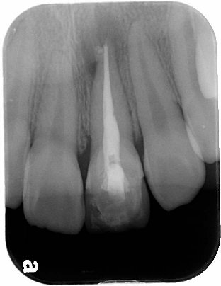 患者王小姐因左上正前牙疼痛劇烈前來求診 , 詳細問診之後, 了解該患者因多年前外傷造成前牙斷裂(見圖一) , 因當時只做緊急處理暫時用複合樹脂補起來 , 並未完整徹底根管治療 , 照數位X光(見圖二)後,發現左上正中門齒有根尖發炎的現象 , 初步診斷為慢性牙髓炎合併根尖骨質破壞 .