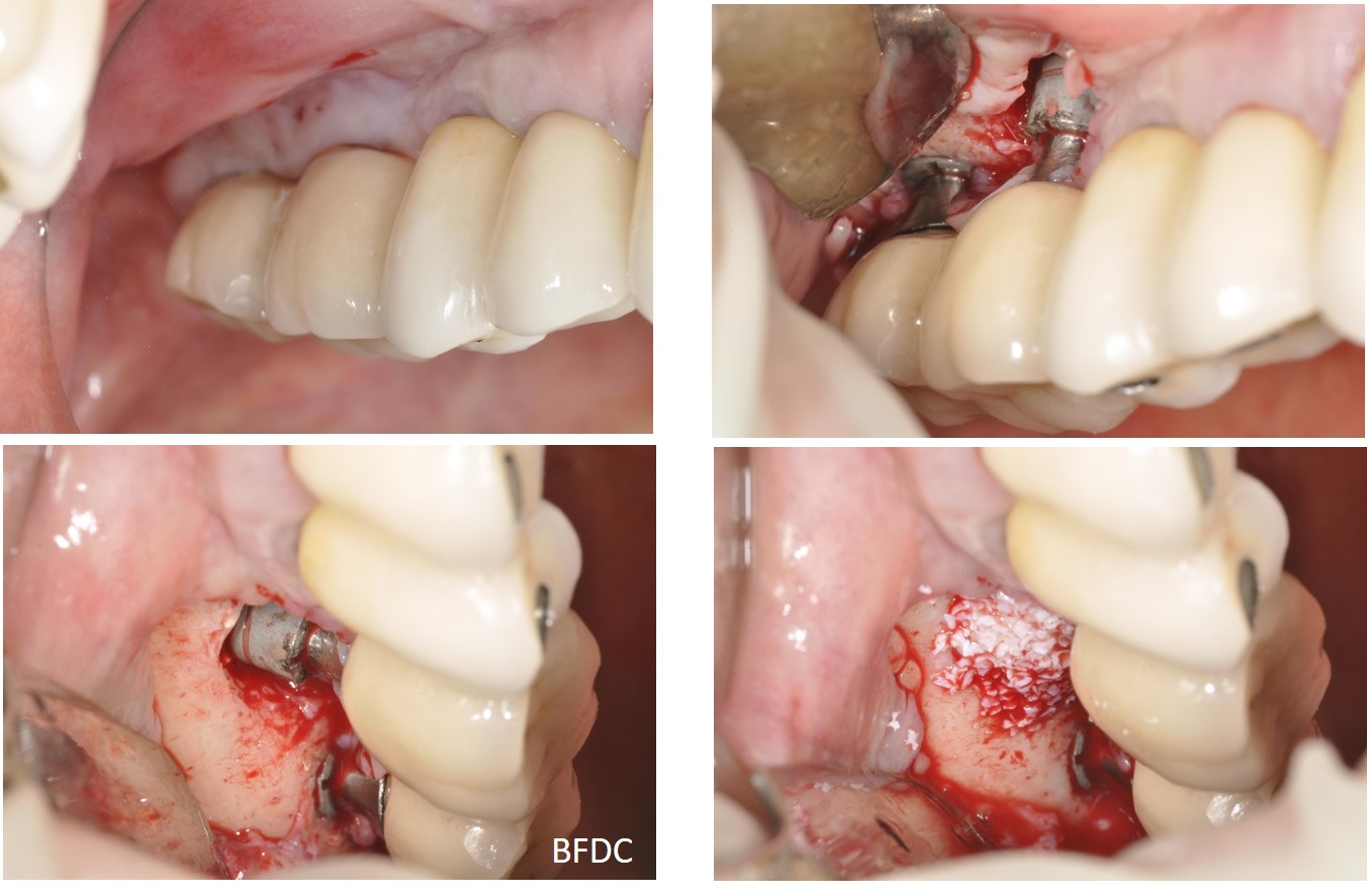 植體周圍疾病,因影響破壞的程度不同,治療的方式亦有所不同。一般可分為非手術性治療及手術性治療。 一、非手術性治療一般有下列幾種方式:1.機械式清創;2.殺菌治療;3.抗生素治療;4.雷射治療。對於侷限在軟組織之植體周圍黏膜炎,非手術性治療幾乎都可解 決。而破壞到周遭骨頭的植體周圍炎,仍會先以非手術性方法來治療。當非手術性治療無法達到目標時,則會進行手術性治療。 二、手術性治療,包括了清創,植體表面去感染,必要時利用骨移植物及再生膜,進行引導骨再生手術(Guided Bone regeneration)重建植體周圍硬組織。
