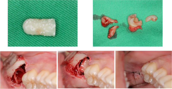 使用骨質增生膠原蛋白,來處理拔牙後的傷口。此材料適用的範圍不僅用於拔牙後傷口,所有顎骨中的病灶於手術後皆建議使用。