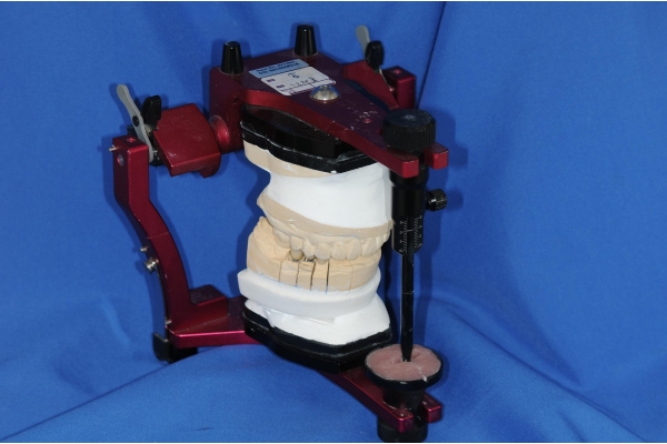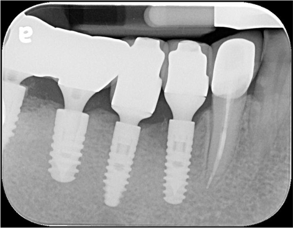 患者因不密合假牙,合併牙周破壞,無法保留牙齒,因費用考量,採植牙牙橋與金屬燒付瓷牙