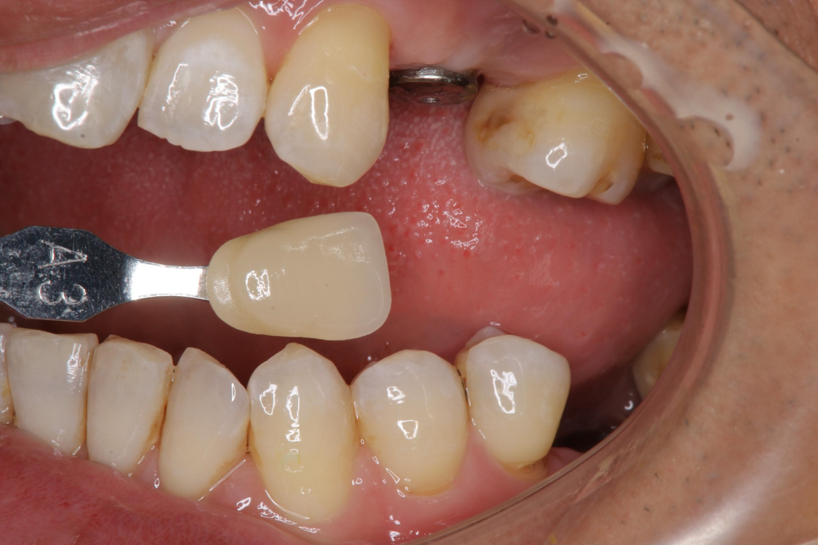 目前市面上植牙假牙主要分為兩種固定方式,黏膠固定式與螺絲鎖緊式兩大派的設計,黏劑固定式假牙如同傳統的固定式假牙,但由於植體的直徑比較小,比較容有殘膠產生,而螺絲固定式假牙的製作比較精密。制作特在假牙頂部保留一微小快拆孔,日後若假牙需要取下維修或加瓷關閉牙縫減少塞食物,過程輕鬆可免受敲擊之苦。且卸下後可於口外清除溢出之界面殘膠,減少殘膠引起植體周圍發炎的可能,再以螺絲固位的方式輕鬆將假牙鎖回植體牙根上。使用單顆植牙,不需修磨正常的牙齒,清潔更方便,且咬合更強。因此本病例採用術式: