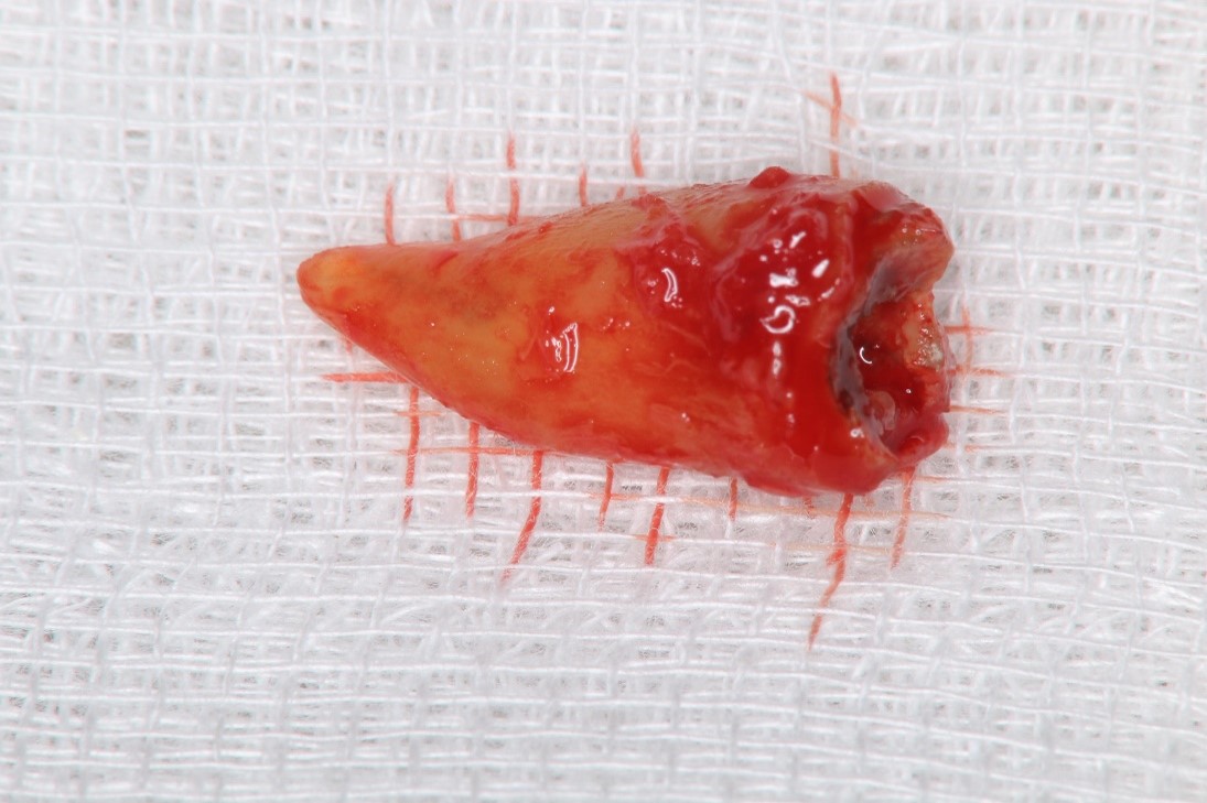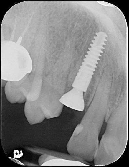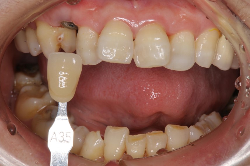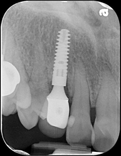 本病患為嚴重蛀牙,導致牙齒斷裂,經評估,骨頭良好,因此可拔牙後立即植牙,減少等待時間,待植體癒合後,再進行膺復處置
