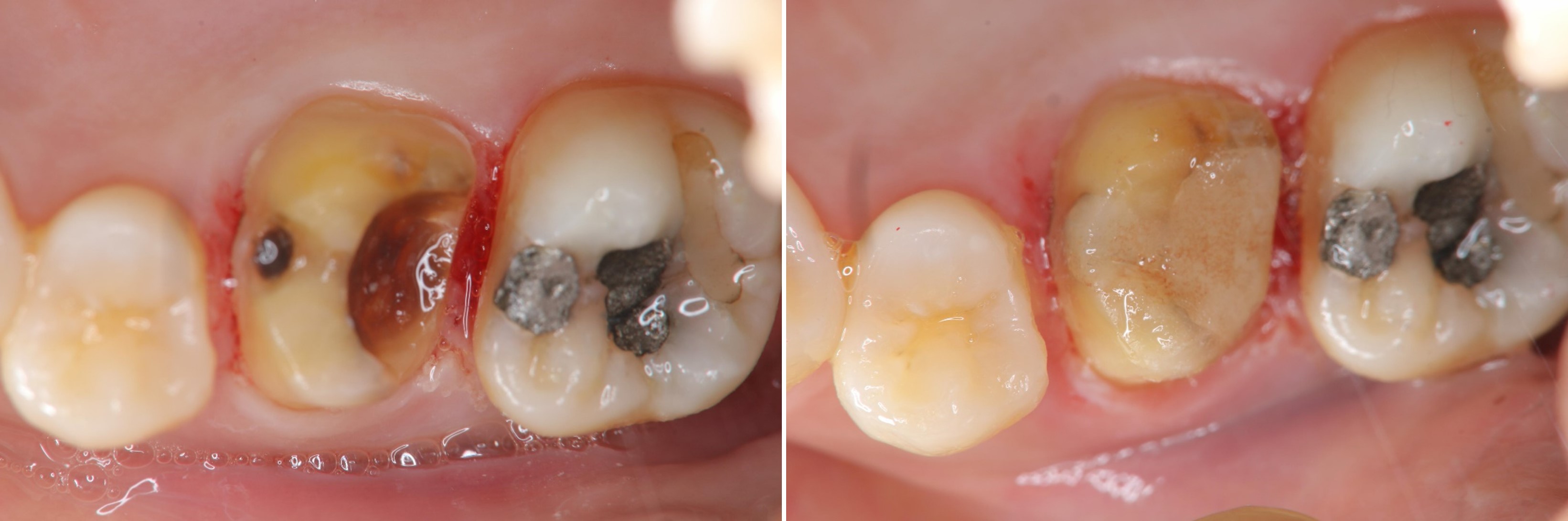 通常患者的蛀牙都在鄰接面、牙齦下,因此傳統必須進行根管治療等治療,但如果沒有蛀至牙髓,早期將牙齦下蛀牙以水雷射切除蛀牙與牙髓,戴上臨時假牙觀察一個月,如果沒有牙髓相關症狀,接著再印模製作假牙,而現今全鋯冠硬度與美觀都相當理想,為現今治療的最前線治療。