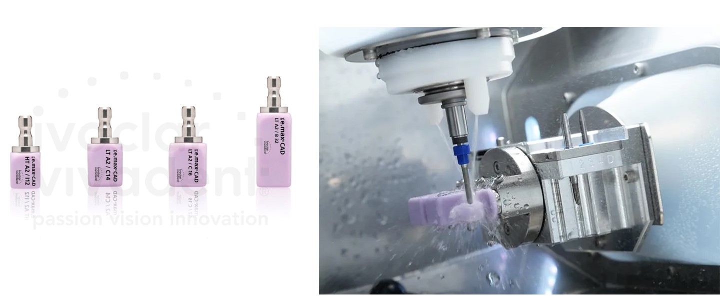 玻璃陶瓷全瓷冠的第二種製作方式,是使用半成品的瓷塊,再經過車床切割後,然後再經過瓷化的步驟,這種製作方式較為快速,但對於一些細微處有時無法表現得那麼的清楚,必須人工輔助,在使用上醫生會與技師討論病人最適合的方式是哪一種。
