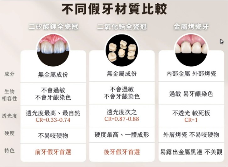 全瓷冠有玻璃陶瓷與二氧化鋯兩種材料可供選擇,玻璃陶瓷的美觀較佳,但是二氧化鋯的材質強度較高,因此醫生會根據患者的需求,咀嚼力等等,來決定患者全瓷冠的最佳材質。