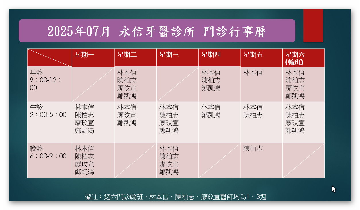 2025年7月永信牙醫診所門診時刻表