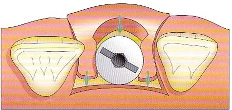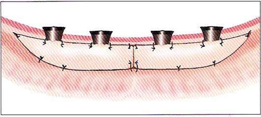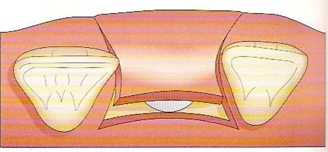 蒂狀瓣是一帶血管的皮下結締組織,對於有大之骨缺損區,是一個可以考量的術式,在顎側取一條皮下結締組織,一端切除,另一端保留血管供應,將蒂狀瓣移至骨缺損區,緊密縫合,待數月後,可得到穩定軟組織