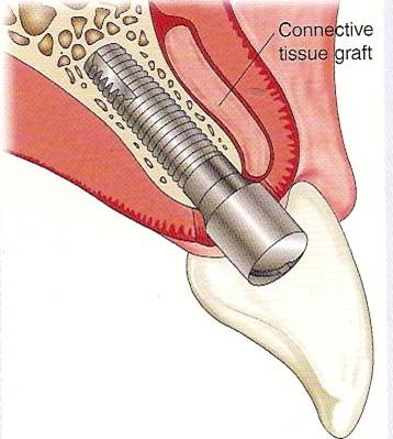皮下結締組織移植術是在上顎的硬顎區,取表皮下,脂肪上的皮下結締組織,再將皮下結締組織移植至植牙區角化牙齦不足夠,將皮下結締組織固定於皮下,可有效的增加角化牙齦厚度,近年來由於隧道式手術的盛行,皮下結締組織移植術更顯出它的重要性(圖39-40)