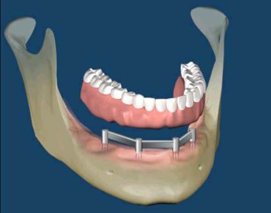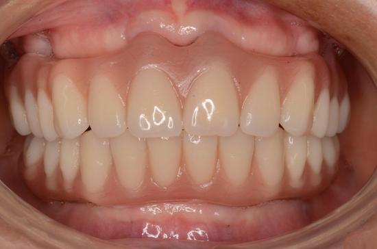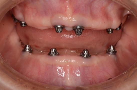 近年來由於人工植牙的技術普及,患者大都知道植牙可做固定式假牙,但同樣的有時患者因為身體、經劑因素等受限,也可以考慮植入幾支人工植牙,再完成固定可撤式活動義齒,這樣可讓活動式假牙的固定性有效加強。通常上顎可用6支植體,下顎則4-5支植體固定,如需更穩定的受力,亦可再增加植體數目。(圖52-55)