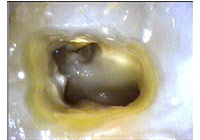 由於顯微鏡具有高倍率的放大效果,並提供卓越的強化光源,牙科的治療都相當微小,一般的放大鏡可放大約2-8 倍,而顯微鏡大約可放大約 30-40 倍, 讓整個治療過程可以持續擁有清晰的視野,所以,顯微治療技術相較於傳統治療,最直接的突破即在於大大地提昇了醫師雙眼的透視能力,使得極細微的組織結構都能夠明顯的被呈現出來。因此,藉由這樣的特性,當顯微鏡被應用在根管治療上,便成為絕佳的利器,可以讓原本難以尋找的根管入口在顯微鏡下無所遁形,而原本錯綜複雜的根管系統也不再是一個讓人無法探索的區域。(圖05~07)