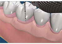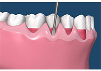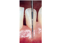牙周病的診斷:檢查時,牙醫師以牙周探針輕輕的偵測牙齒和牙齦間的囊袋。在牙齦線的邊緣,牙齦組織並沒有連到每一顆牙齒。而是,有一條很淺v-型的溝,叫做牙齦溝。正常時,牙齦溝的深度應該小於3毫米,有牙周病時,會形成一個囊袋,堆積更多牙菌斑,更難保持乾淨。當診斷有牙周病後,你的牙醫師可能為你治療或轉診給牙周病專科醫師。牙周病專科醫師專門診斷、預防及治療牙周病,牙周病的治療端視牙周病進行的程度。牙齦炎是牙周病的早期,牙齦變得紅腫且容易流血,在這時期,牙周病是可逆的。(圖03-06)