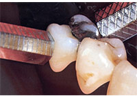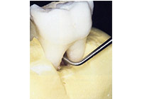當牙齒斷裂至牙齦內,牙齒蛀洞太深延伸至牙齦內難以填補或是剩下牙齒的結構露出牙齦外太少無法做牙套,則可以考慮以牙冠增長術切去部分的牙齦,磨去部分的齒槽骨,使缺損的牙齒露在牙齦之外,以利蛀洞填補或是牙套的製作。此外,有些病患在上顎前牙區域,笑時看到很多的牙齦,牙冠看起來很短,或者是牙齦位置高高低低,局部牙冠的長度不一致,也可以利用此手術方法來增長牙冠長度,使左右相鄰牙齒的牙冠長度及牙齦位置協調一致。臨床上並非所有斷裂或是有缺損的牙齒皆可用牙冠增長手術來處理,有些牙齒的缺損深入牙齦太多,要切太多的牙齦會損失牙齒太多的支持組織,術後牙看起來也會較長,此時可能考慮合併矯正治療將缺損的結構拉出一些再做牙冠增長手術。也有可能因為牙齒破壞太厲害難以修復,將牙齒拔除(圖14-17)。