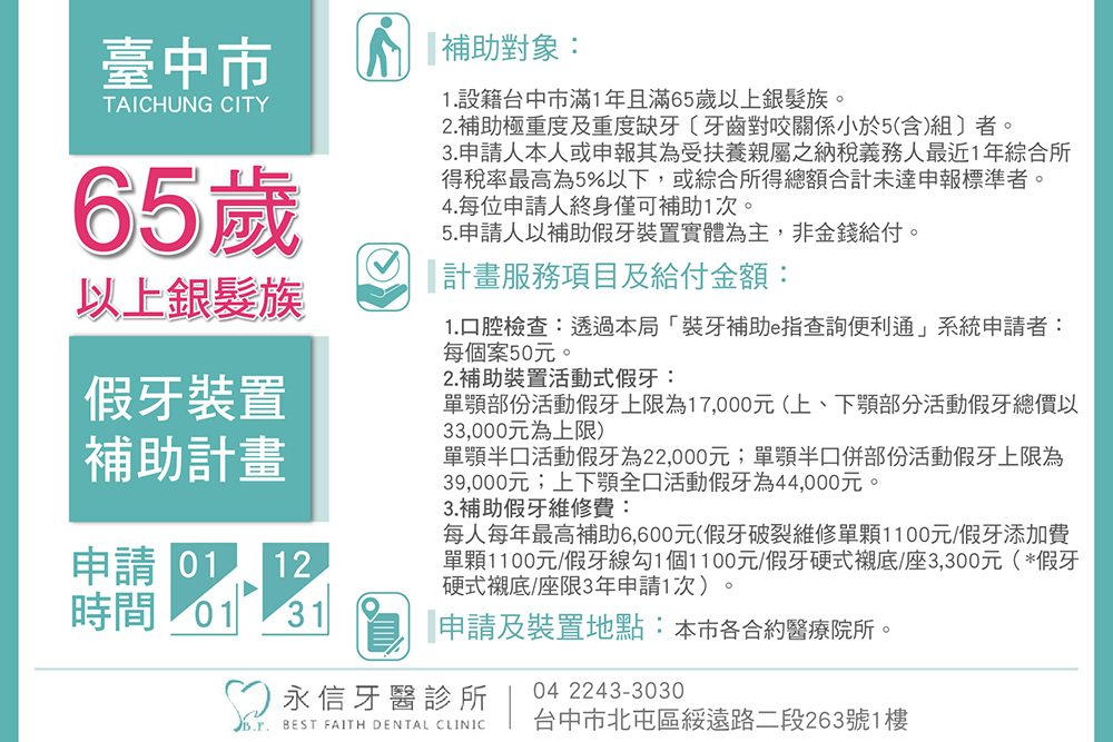 最後關於假牙的補助,不是每一間都有辦法使用,而是要去與衛生署合作的合約牙醫(合約醫療院所之資格:加入本市牙醫師公會(社團法人臺中市牙醫師公會或臺中市大臺中牙醫師公會),具有合格牙醫師證書、開業執照及執業執照。)